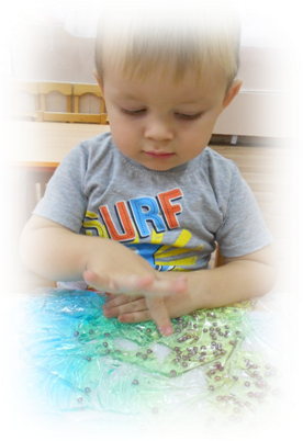 Я заметила, что вновь поступившие малыши очень любят рисовать. Это подтолкнула меня к оформлению «Радужного пакета», на котором можно было делать отпечатки ладошек, рисовать пальчиками различные узоры. Организовать эту игру с малышами проще простого, а впечатлениям и восторгу нет предела. Малыши так увлечённо рисовали, забыв про слёзы и огорчения.