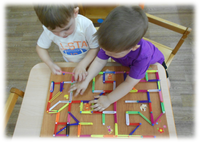 Игра «Волшебные резинки» помогала детям отвлечься от неприятных переживаний, связанных с разлукой с близкими людьми. В ходе этой игры они с удовольствием создавали свои узоры, дорожки, домики, которые мы потом все вместе рассматривали.