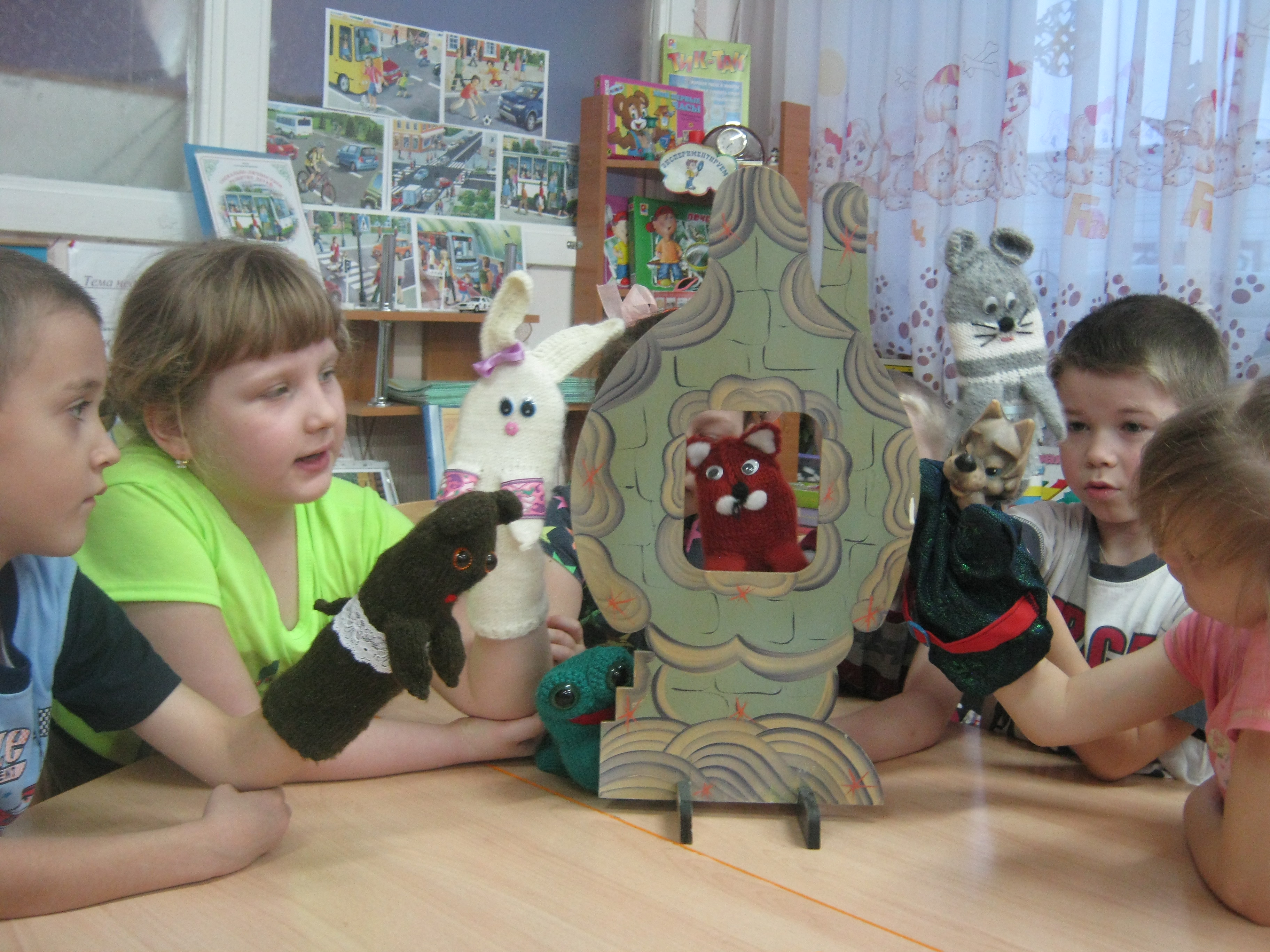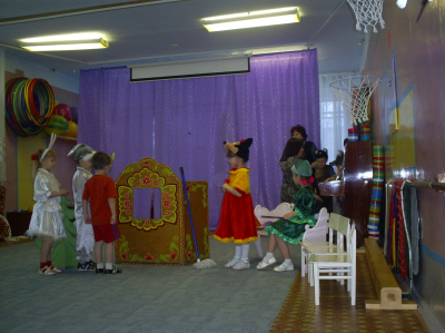 В нашем театральном уголке «Мир театра» есть «Волшебный теремок», где живут сказки. Во время игры в окошке «Волшебного теремка» появляется сказочный персонаж, задача детей – отгадать этого героя и назвать, из какой он сказки, потешки, стихотворения и т.д. Затем с детьми читаем отгаданное произведение, драматизируем. Такая форма проведения позволяет познакомить детей с театральным искусством, способствует созданию у них положительного настроя.