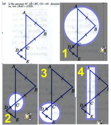 На SMART доске приготовлен чертёж (рис. 3), подсветкой я подсказываю ребятам, на что нужно обратить внимание, с чего начать, порядок рассуждений, так как я при этом ничего не говорю, не комментирую, говорят ребята сами, то у них складывается впечатление, что они сами полностью догадались, как доказать, появляется уверенность в себе, они чувствуют свою успешность.