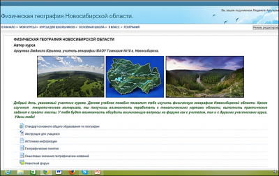 Сегодня в обучении географии в средней школе существует целый ряд проблем. Одной из них, в связи с переходом на ФГОС и уменьшением количества часов в 5-6 классах, становится недостаток времени на изучение природы, населения и хозяйства Новосибирской области. Проблема усиливается отсутствием современных учебных пособий для средней школы. Все это и привело к созданию дистанционного курса «География Новосибирской области» в программе MOODLE на сервере дистанционного образования МАОУ Гимназия № 10. Уже создана и проходит апробацию первая часть курса «Физическая география Новосибирской области» и завершается создание второй части «Экономическая и социальная география Новосибирской области». Для создания курса использовались учебные пособия для средней школы «География Новосибирской области» 1969, 1981, 1996 годов, учебные пособия для НГПУ «Природа Новосибирской области» 2011 года и «Экономическая и социальная география Сибири и Новосибирской области» 2010, атлас Новосибирской области 1979 года, статистические показатели Новосибирскстата 2013–2015 годов, интернет-ресурсы.