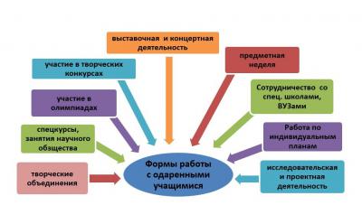 Одним из необходимых условий для развития и реализации творческих способностей учащихся является расширение единого образовательного пространства. В единой системе общего и дополнительного образования используются следующие формы работы с одаренными учащимися (рис. 1).