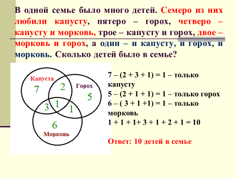 Ведущий 2: Задачи, решаемые с помощью кругов Эйлера, очень часто предлагаются на математических олимпиадах. Подобные задачи часто имеют практический характер, что важно в современной жизни. Они заставляют задумываться и подходить к решению какой-нибудь проблемы с разных сторон. Учат выбирать из множества способов наиболее простой и легкий.