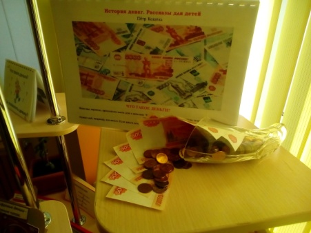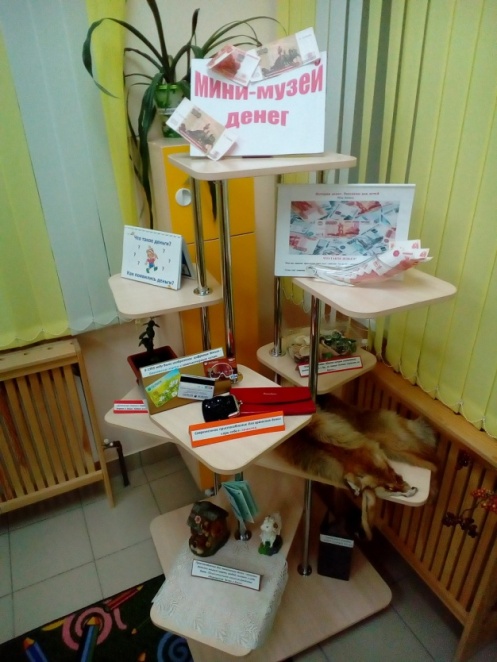 В нашей группе был организован «Мини музей денег». Экспонаты для музея собирали с помощью родителей, которые охотно приняли в этом участие. Были оформлены альбомы «Коллекция монет», коллекция бумажных денег разных стран и времен «Какие бывают деньги?», в нашем музее были представлены монеты даже времен Петра 1. Наглядно были представлены способы накопления и сбережения денег – сберегательные книжки, электронные банковские карты, копилки, также в музее присутствовали «Первые деньги» – ракушки, соль, меха. На протяжении работы нашего музея его посетили дети других групп, педагоги, родители – мы получили массу приятных отзывов от посетителей.