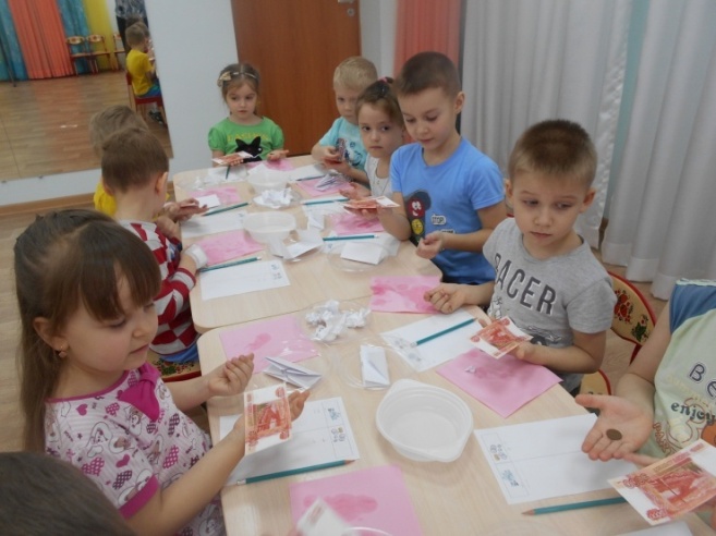Учитывая, что у дошкольников старшего возраста преобладает наглядно-образное мышление, то основным видом деятельности является игра, детям для сюжетно-ролевых игр «Магазин. Супермаркет» было предоставлено много разнообразного игрового материала, внесены в кассу (распечатанные) купюры разного достоинства, в игре дети познавали на практике правила «купли-продажи», учились соотносить стоимость товара, приобретали практические навыки обращения с деньгами.