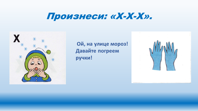 Звук (х) – греем замерзшие руки (расположить прямые кисти обеих рук на уровне рта ладонями к лицу);