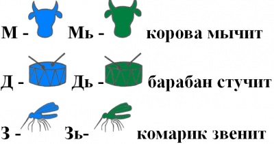 Формирование навыков звукового анализа начинается с гласных звуков, так как их проще воспринять, выделить, в слогах, в словах, чем согласные. Согласные звуки воспринимаются и дифференцируются дошкольниками сложнее. Поэтому используем одноцветные картинки – символы, которые позволяют сформировать яркий зрительный образ, который концентрирует, уточняет восприятие соответствующего согласного звука. У всех символов согласных звуков цвет должен быть синим (твёрдые согласные) или зеленым (мягкие согласные).