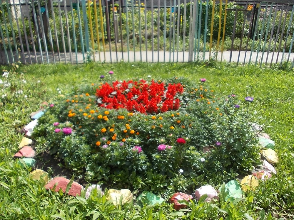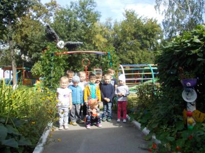 На территории детского сада создано несколько цветочных клумб. В центре одной из клумб растут циннии в окружении шафранов. На другой цветочной клумбе в центре растут красные сальвии в окружении разноцветных астр. Также есть клумба с однолетними петуньями в окружении многолетников. Этим летом созданы еще две новые клумбы-горки. Это перевернутые детские горки, на которых красивым ковром растут бархатцы.