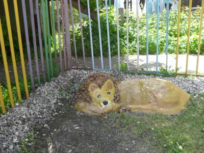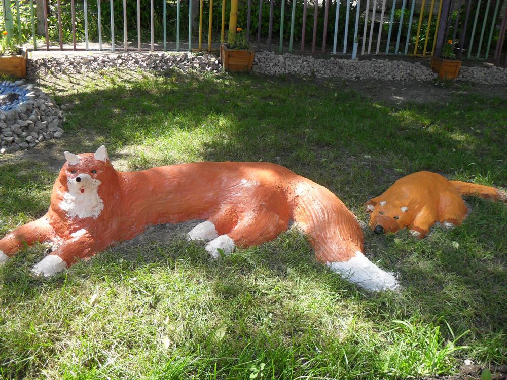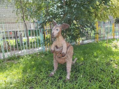 Силами педагогов был сделан «Веселый зоопарк», в котором поселились: белый и бурый медведь, лиса с лисятами, лев, ежи, кролик, крокодил, жираф, носорог, кит. А в этом году добавились кенгуру с кенгуренком, волк, черепаха. Дети очень любят приходить в зоопарк, рассматривать скульптуры животных и играть с ними.