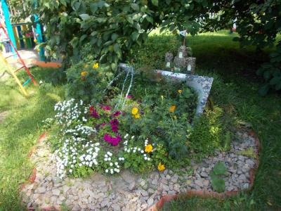 Центральную клумбу от участка отделяет забор из досок, на которых изображены дети и воспитатели группы «Пчелки». Изображения выжигались, раскрашивались, затем лакировались. В эту работу были активно вовлечены родители воспитанников. Центральную клумбу украшает небольшой прудик, который охраняет черепаха Тортилла и колобок, здесь же располагается каменный замок и ветряная мельница. Также на участке имеется искусственный пруд, изготовленный из пластиковых голубых бутылок. В центре этого пруда стоит аист.