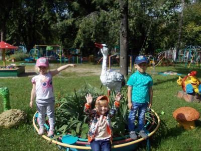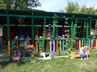 Возле красочно оформленной веранды ребят радует «Чудо-дерево» из сказок К. И. Чуковского, на котором висят и фрукты, и цветы, и овощи, конфеты, подсолнухи, сапоги, баранки и т.д. А еще педагоги придумали терем-теремок, который расположен в настоящем дереве на участке. По периметру всего участка можно увидеть и других сказочных персонажей (жирафа, цыплят, божьих коровок и т.д.).