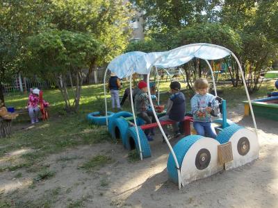 На участке имеется столик-пенек с цветником в центре, за которым детям можно удобно расположиться и заняться рисованием. Также на участке нашлось место для самодельной машины, изготовленной из шин, пластиковых труб и тента, деревянных скамеек.