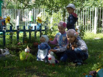 На участке старшей группы вас встретит веселая бабушка и два ее веселых гуся.