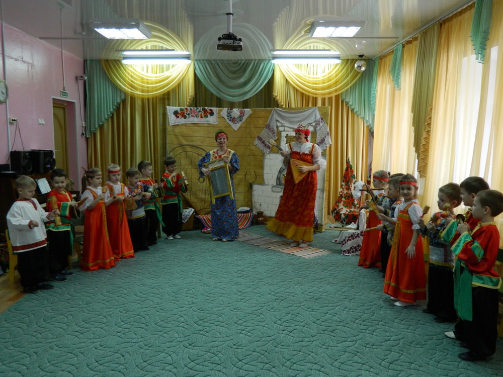 На музыкальных занятиях знакомили ребят с русскими народными инструментами. Перед нами стояли задачи: обучить детей простейшим навыкам игры на русских народных инструментах, таких как трещотка, флейта, рубель (предмет домашнего быта, который в старину русские женщины использовали для глажения белья после стирки), колотушка, ложки; значительно расширить объем песенного репертуара, добавить песни шутливо-комического характера; инсценировать и импровизировать песенный материал; ввести в каждое занятие разминку – упражнения для дыхания, звукообразования и т.д.; ввести частушки, учить понимать их, показывать характер героя, петь, плясать, подыгрывать на музыкальных инструментах; воспитывать эмоциональную отзывчивость при исполнении и прослушивании песен разного характера.