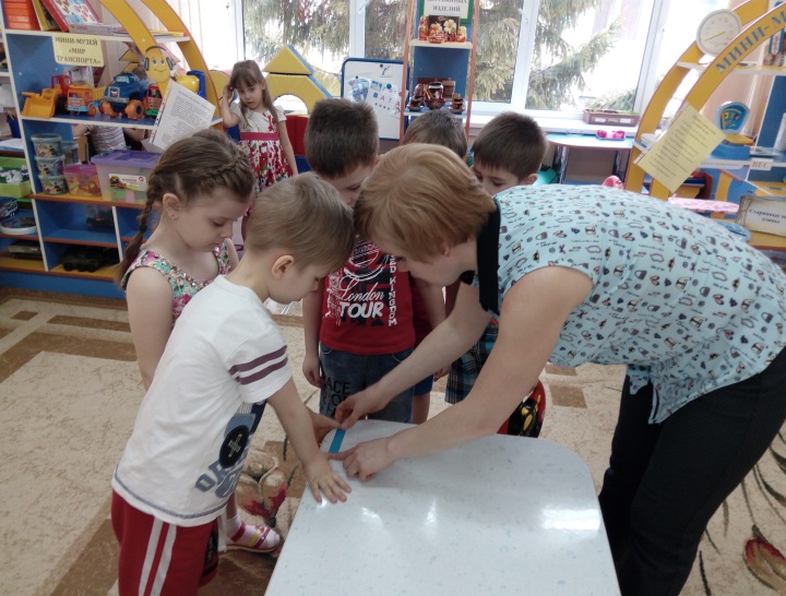 – А у нас в музее как раз новый предмет появился, Кто заметил его в музее? (дети находят в мини-музее линейку и твёрдый деревянный метр)