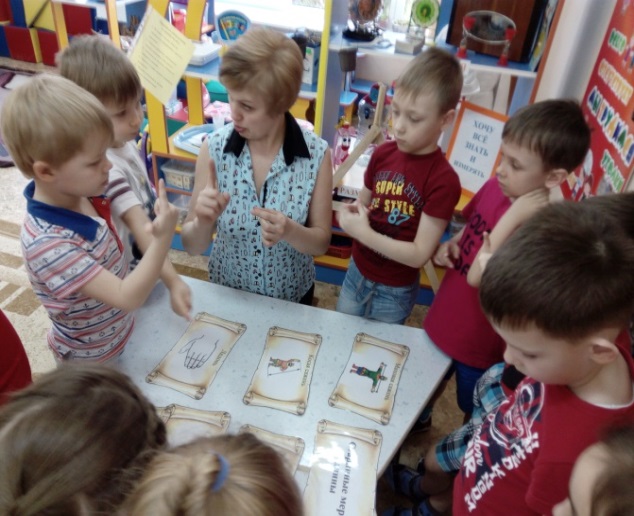 Воспитатель с детьми изучают карточки