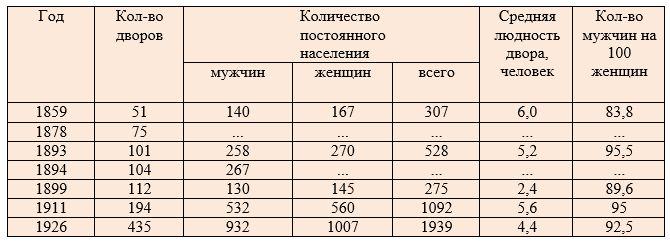 Рассматривая таблицу 1 и график на рисунке 2, мы прежде всего обнаруживаем быстрое и последовательное, от одного временного среза к другому, увеличение количества дворов (домохозяйств) в Мочище. В 1859 г. в деревне имелся только 51 двор, а к 1926 г. их стало уже 435. За 67 лет численность домохозяйств увеличилась в 8,5 раз. Быстрое прибавление количества домохозяйств в поселении, особенно с конца XIX в., было связано, вероятно, с тем, что изучаемый период был временем интенсивного аграрного переселенческого движения в Сибирь, и больше всего переселенцев прибыло в это время на территорию Алтайского горного округа, в состав которого входили Кривощёковская, а затем и Каменская волости.