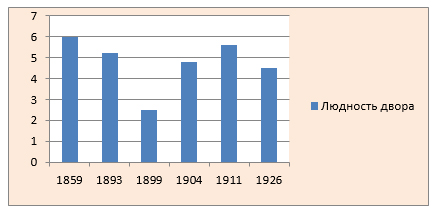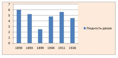 Теперь посмотрим по данным таблицы 1 и диаграммы на рисунке 3, как менялась средняя людность домохозяйства в поселении. Мы увидим, что этот важный показатель со временем сокращался, хотя в начале XX в. было зафиксировано временное его увеличение, сменившееся новым спадом. Такая динамика в принципе соответствует известной историкам закономерности: в период модернизации традиционного общества крупные по величине, сложные по составу родственные ячейки постепенно уступали место небольшим и простым по структуре[10].