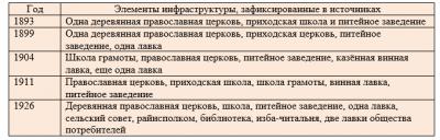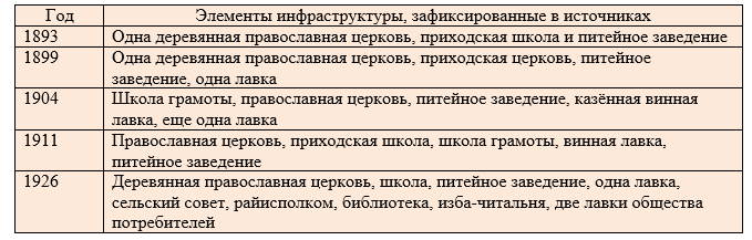 В целом можно сказать, что поселение Мочищенское во второй половине XIX – начале XX в. успешно развивалось. Это видно не только по увеличению численности населения и количества дворов, прогрессивной перестройке семейной структуры, но и по расширению местной поселенческой инфраструктуры (табл. 2).