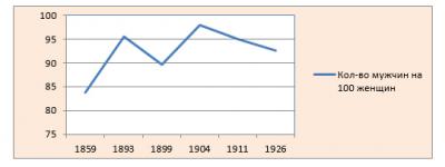 Таблица 1 и график на рисунке 4 демонстрирует нам численное соотношение мужской и женской частей населения в Мочище изучаемого периода. Сразу же очевидно, что мужская часть населения постоянно находилась в меньшинстве, однако со временем всё же повышала свое представительство в населении. Эта закономерность была нарушена к концу изучаемого периода, когда войны и революции вновь снизили количество мужчин.