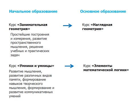 Например, курс внеурочной деятельности «Занимательная геометрия» в начальной школе, позволяющий обучающимся формировать умения решать учебные и практические задачи средствами геометрии в ходе игровой и практической деятельности, является стартовой площадкой для изучения спецкурса «Наглядная геометрия» в основной школе. Курс внеурочной деятельности «Умники и умницы» в начальной школе, позволяющий развивать мышление, формировать умения решать нестандартные задачи, является основой для изучения на уровне основного общего образования курса «Элементы математической логики», который продолжает формировать умение производить рассуждения, умозаключения, аргументировать, доказывать и опровергать, применять основные логические законы и знания логики в процессе изучения смежных дисциплин.