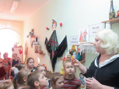 Наш музей регулярно посещают воспитанники других групп, а дети нашей группы поддерживают в нем порядок. Музей постоянно пополняется макетами, сделанными руками воспитателей и детьми. Мы часто проводим мастер-классы, на которые приглашаем наших любимых бабушек. Они учат детей создавать различных кукол, учат вышивать на пяльцах, угощают детей блинами. Дети своими руками расписывают фартуки под гжель, досточки под хохлому, ложки, вазы в разных стилях декоративно-прикладного искусства.