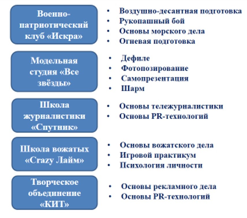 Благодаря сложившейся системе социального партнерства, учащиеся выезжают во время летних каникул на профильные смены, которые погружают в тематику профессий и процесс реальной трудовой деятельности. Традиционно наши курсанты участвуют в городских и областных профильных сменах, таких как: «Юный десантник», «Патриот», «Юный моряк». Во время профильных смен ребята могут не только продемонстрировать свою физическую подготовку, знания и умения в разных военно-спортивных дисциплинах, но и проявить лидерские качества, умение работать в команде. Педагоги нашего структурного подразделения активно и успешно апробируют организацию краткосрочных профильных смен в течение всего года для учащихся общеобразовательных учреждений Дзержинского района, направленные на погружение ребят в атмосферу профессионализма, например: «Юный журналист», «Красота. Здоровье. Грация», «ЛидерSkills».