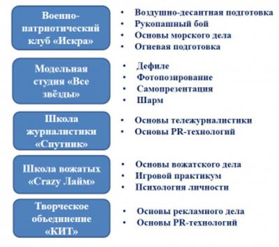 Реализуя это направление, в первую очередь, педагоги творческих объединений нашего структурного подразделения проводят серию занятий, рассказывающих о различных сторонах той или иной профессии, активно используют такие формы занятий, как: деловые и ролевые игры, дискуссии, круглый стол и другие, которые дают возможность учащимся «смоделировать», и «проиграть» жизненные и профессиональные ситуации. Данные формы работы с подростками способствуют развитию коммуникативных компетенций, формированию адекватной самооценки и осмыслению своих личностных качеств.