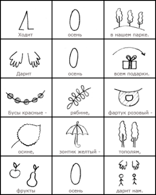 Мнемотаблицы особенно эффективны при разучивании стихотворений. Суть заключается в следующем: на каждое слово или маленькое словосочетание придумывается картинка; таким образом, всё стихотворение зарисовывается схематически. После этого ребенок по памяти, используя графическое изображение, воспроизводит стихотворение целиком. На начальном этапе предлагают готовую план-схему, а по мере обучения ребенок также активно включается в процесс создания своей схемы.