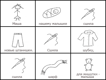 В мнемотаблицах наглядность представлена в виде предметных картинок, последовательно расположенных в соответствии с планом высказывания. С помощью мнемотехники решаются следующие задачи: