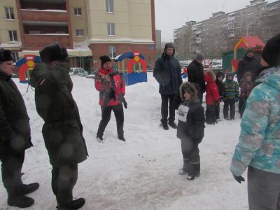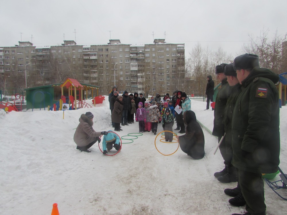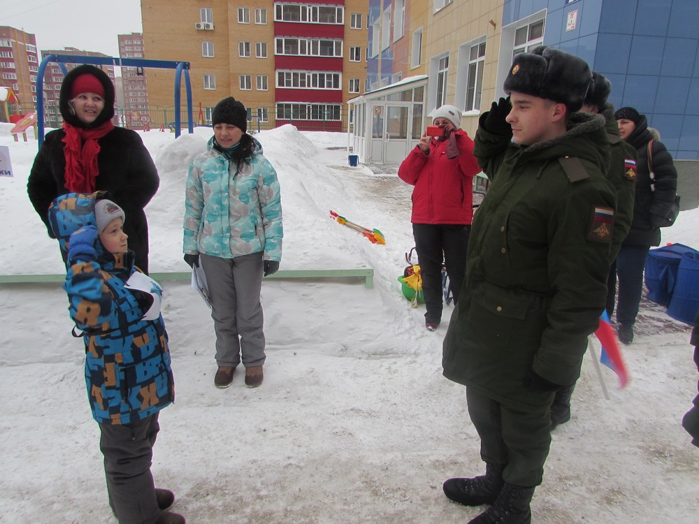 На площадке детского сада выстроились две команды: «Лётчики» и «Танкисты», в одном строю стояли дети и их отцы. Сквозь семейный строй военнослужащие вынесли флаг Российской Федерации. Все присутствующие замерли под звуки Гимна РФ. Волнующий и трогательный момент праздника. С приветственным словом к ребятам обратился приглашенный на праздник командир воинской части. Капитаны команд доложили командиру о готовности к началу проведения военно-спортивной игры и получили «боевое» задание.