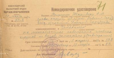 Командировочное удостоверение, выданное главному хирургу Шнейдеру С.Л., для поездки в Челябинск на межобластное совещание главных хирургов. НГА.Ф.174-л.Оп.1.Д.10.Л.71