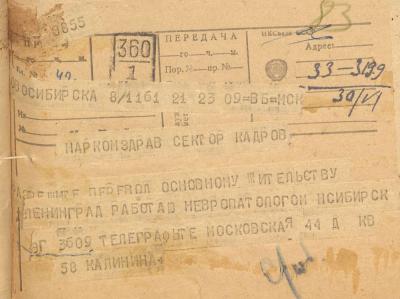 Телеграмма сектора кадров НКЗ СССР с разрешением на переводе невропатолога эвакогоспиталя 3609 по основному месту жительства в Ленинград