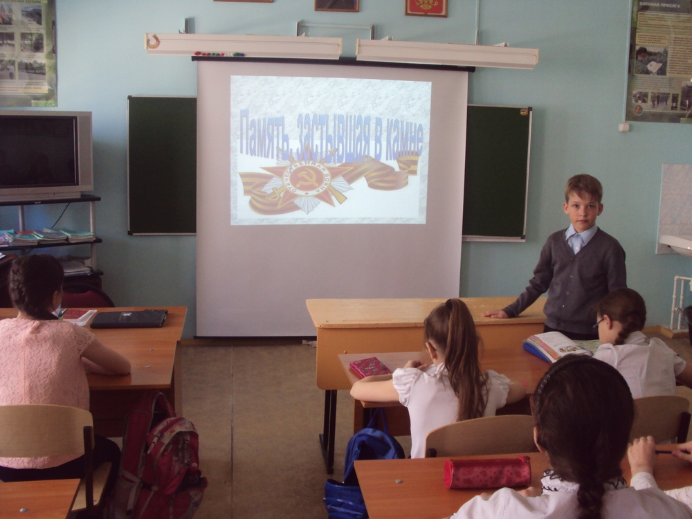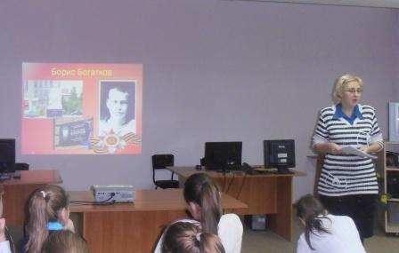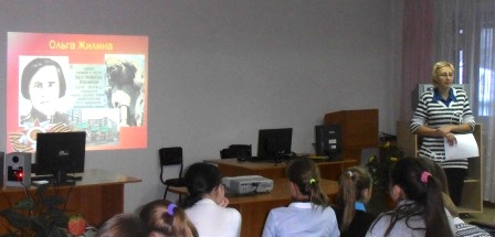 – Час мужества и урок памяти. Эта форма наиболее полно раскрывает представление о мужестве, долге, чести, ответственности, нравственности. Заставляет школьников задуматься, что такое патриотизм. Воспитывает уважение молодежи к ветеранам, к защитникам отечества. Знакомит с героическими и трагическими страницами истории нашей Родины. Такие уроки и часы проводятся ежегодно для 5–9 классов. Начинается учебный год, и мы вспоминаем о подвиге сибиряков с завода Сибсельмаш, многие слышали саму песню «На безымянной высоте», но даже не догадывались, что она написана о подвиге наших земляков, парней и мужчин, которые ходили по тем же улицам нашего района, что и мы сейчас. В декабре я провожу урок «Улицы расскажут о героях», где школьники узнают о людях нашего города, воевавших на фронтах Великой Отечественной войны, отдавших жизнь за нашу страну. Родной город чтит их память переименованием улиц в их честь. Я вспоминаю на этих уроках Б. Богаткова, О. Жилину, Н. Плахотного, А. Гаранина, Ф. Ивачева; рассказываю о подвигах, которые они совершили. Похожее мероприятие проходит ко Дню Победы «Память, застывшая в камне», какие-то памятники знакомы ребятам, и они сами рассказывают о них (Мемориал Славы, памятник А. Покрышкину), о каких-то рассказываю я (стела в Аллее блокадников, стела «Штыки», памятник Б. Богаткову, скульптура «Раненый воин»). Эти уроки призваны показать школьникам все трудности войны и военного времени.