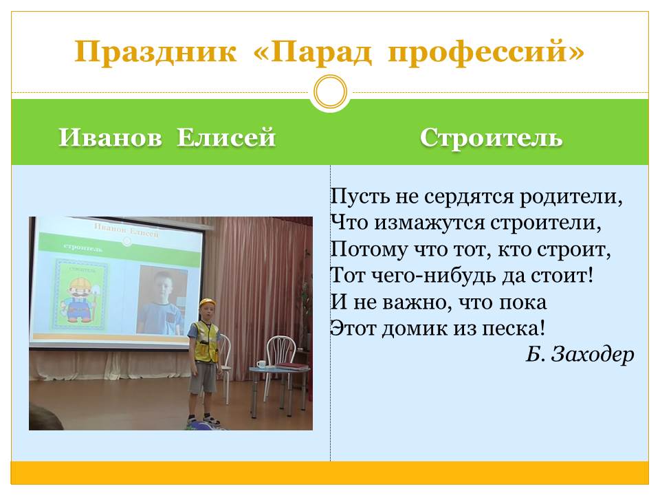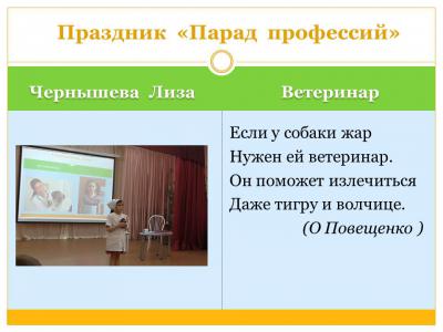 В завершении нашего проекта был проведен праздник «Все работы хороши», в котором приняли участие все воспитанники группы и родители. Все дети на празднике были в костюмах различных профессий, а в руках предметы, необходимые для данной профессии. Каждый ребенок представлял свой костюм стихами, презентацией, рассказом. На празднике был систематизирован весь материал по теме проекта, дети называли большое количество профессий, пословиц, поговорок о труде, орудиях труда, составляли описательный рассказ о профессиях. Музыкальный руководитель Баширова Ольга Александровна подготовила музыкальный репертуар по теме нашего проекта.