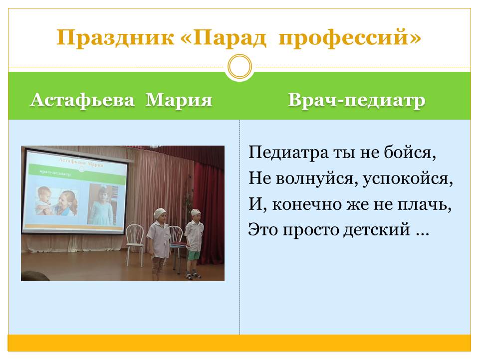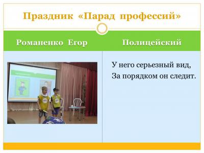 В прошлом учебном году наша группа «Вишенка» запланировала в конце учебного года подготовить презентацию «Защита портфолио». К формированию копилки достижений дошкольника мы шли не один год и собрали довольно большой материал. Для того чтобы получилось интересно и эффективно, мы решили привлечь всех детей нашей группы и их родителей. Так как наши дети повзрослели и готовились стать взрослыми, мы решили познакомить их с миром профессий. Выбор профессии – жизненно важный вопрос.