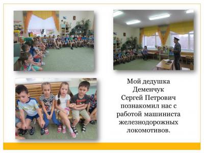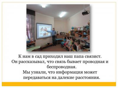 В течение учебного года к нам в группу приходили родители, рассказывали о своих профессиях и презентовали результаты своего труда. Так как в нашей группе большое количество мальчиков, мы были рады познакомиться с мужскими профессиями родителей. Мы познакомились с профессией военного связиста и с работой машиниста железнодорожных локомотивов. Ребята узнали о том, что связь бывает сотовая, проводная и беспроводная; узнали новые способы передачи информации на расстоянии; познакомились с новыми телефонными устройствами и приборами связи.