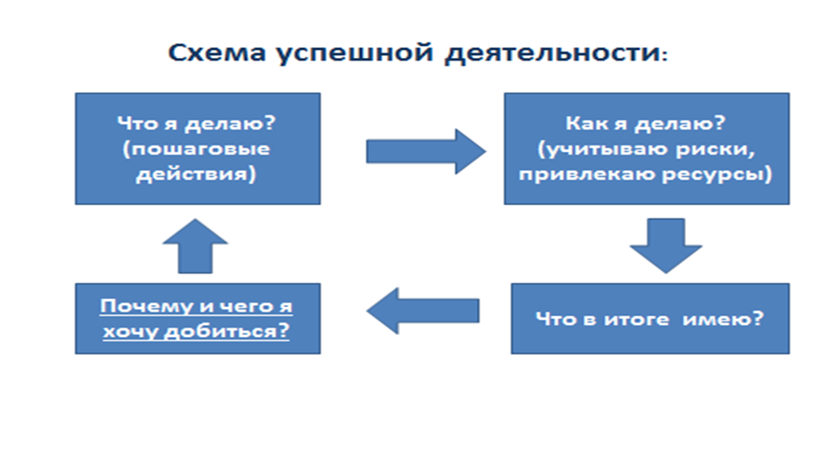 Каждый участник на листочке формулировал цель, планировал, что он должен делать, оценивал риски, препятствия, определял, какие ресурсы могут помочь в достижении. После этого рассматривалась схема успешной деятельности.