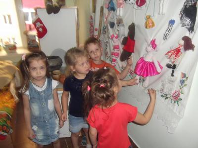 Начиная с младшего дошкольного возраста, мы прививаем детям любовь к сказкам. В своей работе мы активно используем театральную деятельность, в тесном контакте также с нами работают музыкальный руководитель и логопед. Принимая во внимания особенности наших детей, их речевые нарушения, приобщаем детей к театральной деятельности поэтапно, с постепенным усложнением. Легче всего ребенок справляется с театром теней, проводя элементарные манипуляции с персонажами, далее следует знакомство с «Пальчиковым театром», когда ребенок не делает никаких лишних движений, используется только речь. Следующий вид театра, с которым мы работаем – это «Колпачковый театр». Игрушки для этого театра изготавливаем вмести с детьми – это только повышает их ценность. В непосредственно образовательной деятельности мы используем «плоскостной театр». На занятиях по ручному труду, аппликациях, мы создаем плоскостные виды разных предметов: птицы, рыбы, насекомые и т.д. Разыгрывая постановки с такими персонажами, дети легче запоминают их при изучении темы «Животные». В игровой деятельности мы используем театр масок. Надевая изготовленные своими руками маски, дети обыгрывают их в спектаклях и свободной деятельности. Театр БИ-БА-БО хорошо использовать для диалогической речи.