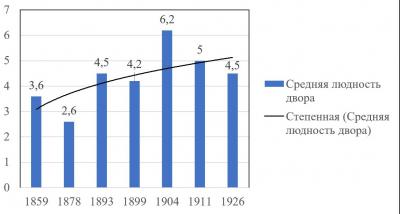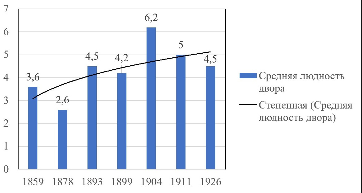 Таблица 1 содержит, среди прочих данных, диахронический ряд высчитанных нами показателей людности дворов в с. Болотном. Мы видим, что домохозяйства в этом поселении почти на всем протяжении изучаемого периода были небольшими по количеству их членов. Людность менялась со временем противоречивым образом, что наглядно демонстрирует гистограмма, помещенная на рисунке 2. Степенная линия тренда свидетельствует, однако, что господствовала тенденция к увеличению показателя. Его наибольшее значение было зафиксировано в «Списке населенных мест» 1904 г. Такая тенденция нетипична для страны в целом, для Сибирского региона и для многих конкретных сельских населенных пунктов, развитие которых было изучено ранее по методике В. А. Зверева.