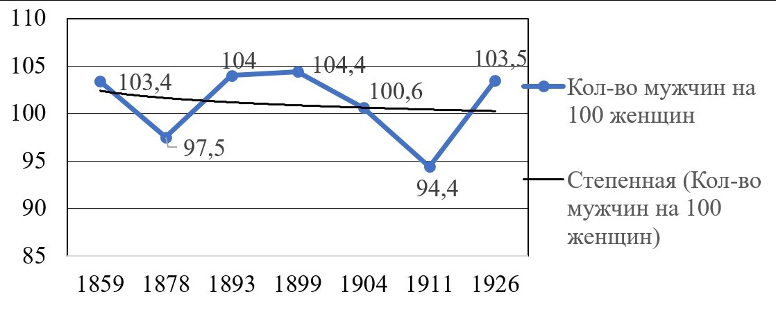 Данные «Списков населённых пунктов» позволяют выявить стандартное для демографических исследований соотношение мужской и женской частей населения – количество мужчин на 100 женщин [10]. По данным «Списков населенных мест» мы построили динамический ряд соответствующих показателей применительно к с. Болотному (см. табл. 1). Теперь представим этот ряд на графике с добавленной степенной линией тренда (рис. 3).