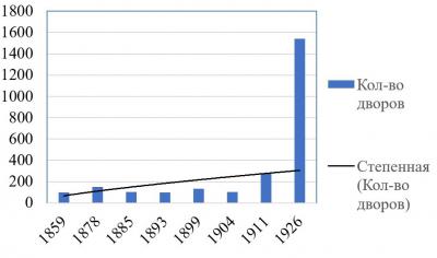 Таблица 1 свидетельствует о непоследовательности изменений количества дворов в с. Болотном: до начала ХХ в. оно то увеличивалось, то сокращалось. Более определенную картину представляет построенная нами столбчатая гистограмма с добавленной степенной линией тренда (рис. 1).