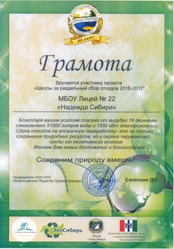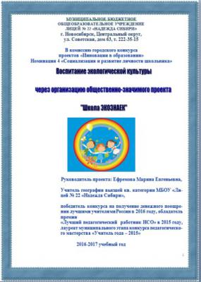 Идея проекта зародилась на уроке географии при изучении темы «Географическая оболочка». Были рассмотрены взаимосвязи между компонентами природы. Для сбора исследовательских данных учащиеся и их семьи в течение месяца вели раздельный сбор мусора. В настоящее время результаты исследования оформлены в готовую презентационную работу. Материалы были представлены в проекте «Воспитание экологической культуры через организацию общественно-значимого проекта «Школа ЭКОЗНАЕК». Данный проект был представлен на конкурс «Инновации в образовании» в Центральном округе города Новосибирска в 2017 г и отмечен призом за второе место в номинации.