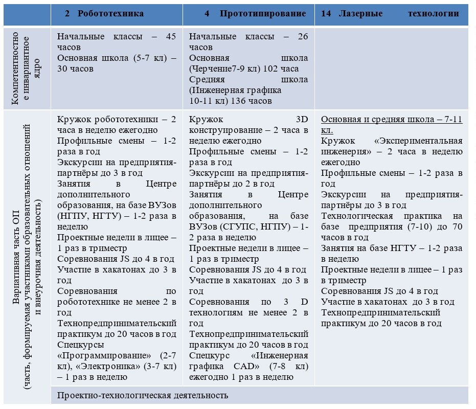 Вовлечение детей в новые формы деятельности потребовало внесения изменений в учебный процесс. В начальной школе был преобразован учебный план, выделены модули из традиционных предметов: из математики выделили наглядную геометрию, из технологии – моделирование, конструирование, робототехнику, информационные технологии, из окружающего мира – первое исследование. Во внеурочной деятельности добавились модули бумагопластика, ТРИЗ, экономика, программирование. Все вышеперечисленные изменения – это пример влияния только одной компетенции – робототехники, и только в 1-3 классах, чтобы в 4-м классе дети смогли проектировать, собирать, программировать роботов. Такой же лавинообразный поток изменений стал генерироваться на втором и третьем уровнях образования. Параллельно шло формирование компетенций НТИ. Результатом первого года преобразования программы стало 1 место на олимпиаде НТИ «Инженерные биологические системы» в личном первенстве и выход двух команд по данному профилю в финал, на Hi-Tech в городе Екатеринбург по компетенции «Производство и обслуживание летательных аппаратов» и на международной выставке школьных технопредпринимательских компаний в г. Берлине – 2-е места.