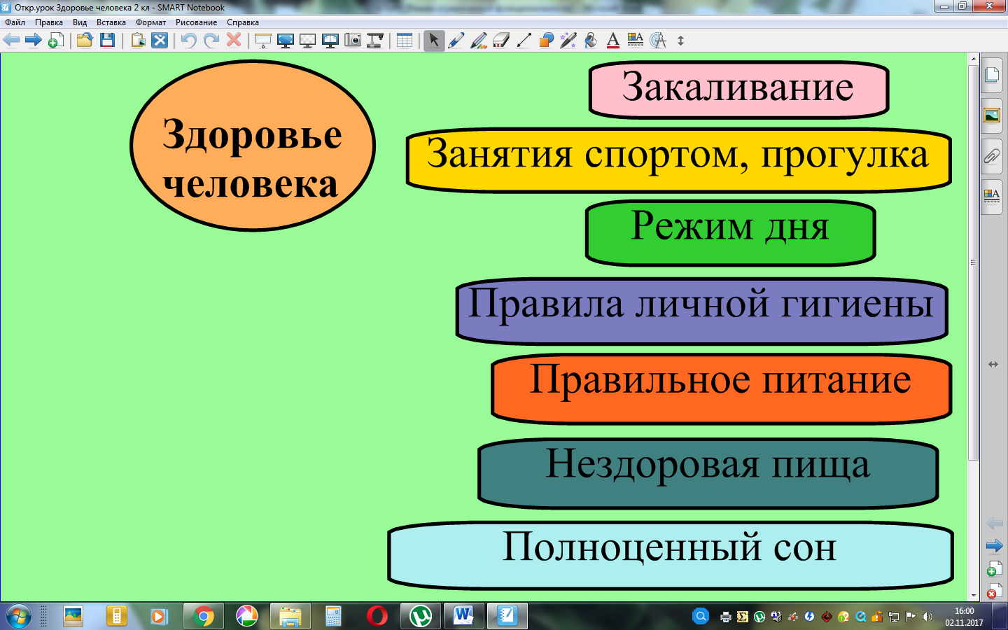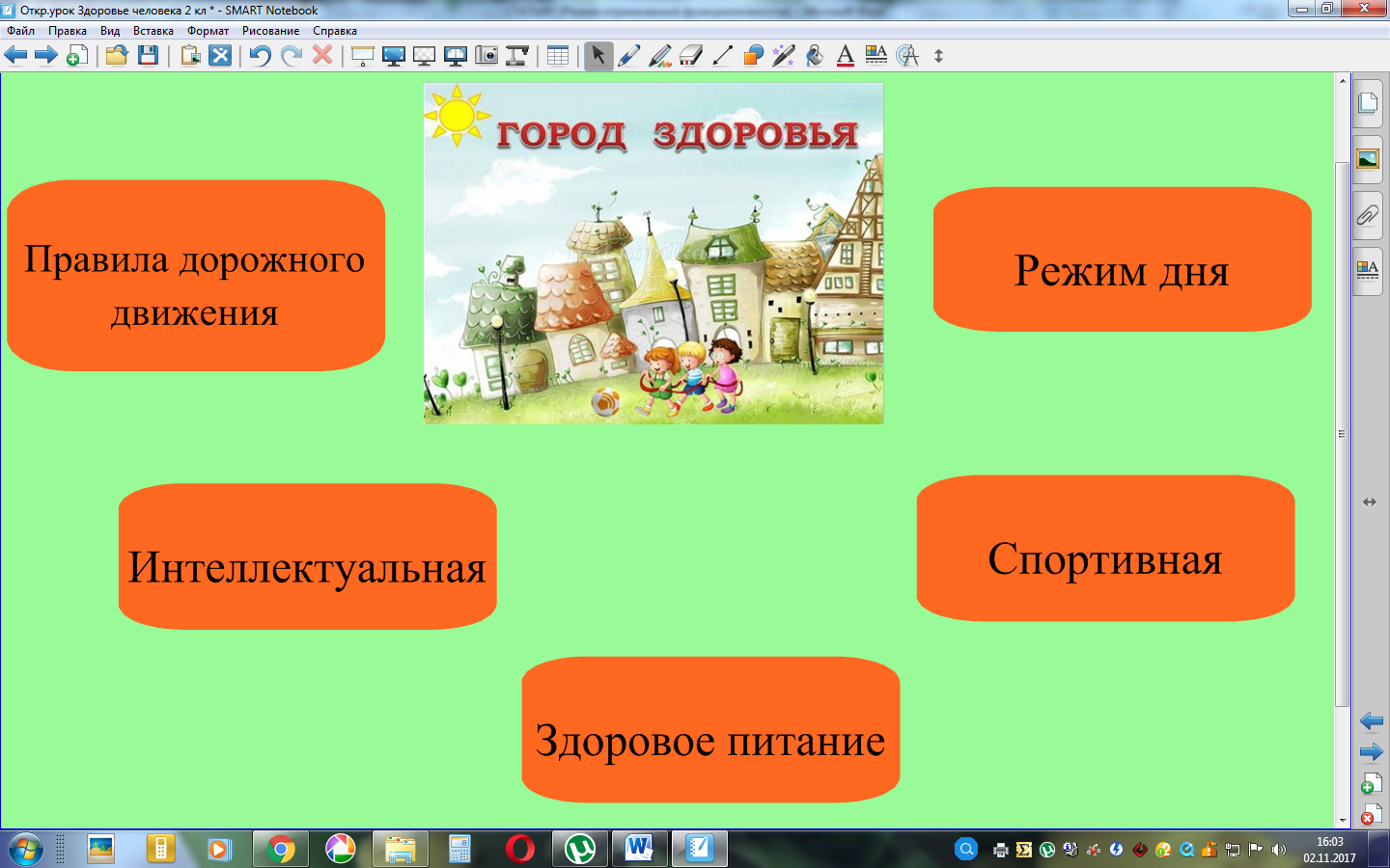 На этапе мотивации детям был предложен вопрос: как учитель может оценить, приобрели ли вы знания по теме «Здоровье человека»? Ребята предлагали провести тест, контрольную работу, некоторые даже предложили экзамен(!). Но учительница намекнула, что можно выбрать более современное средство проверки знаний – создать квест с заданиями по этой теме для других классов. Выяснили, что такое квест, играл ли кто – то в такую игру. Дети с удовольствием согласились побыть в роли учителя, создать задания, а потом поиграть со своими сверстниками. Таким образом, дети самостоятельно поставили цель урока. Как же будем создавать задания, ведь тема большая и все вместе мы не успеем за урок все охватить. Дети предложили разделиться на группы, и каждая группа будет создавать свое задание. Для деления на группы был выбран способ деления по цветовым карточкам. Для систематизации знаний по данной теме, детям было предложено построить пирамиду, выбрав нужные компоненты. Для создания квеста командам предлагалось путешествие в город Здоровья, прохождение несколько станций с выполнением заданий, после чего на каждой станции команде выдается кусочек ключевой фразы. В конце квеста команды должны собрать всю фразу и открыть ворота в город Здоровья.