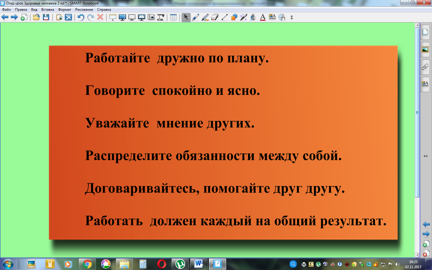 Итак, дети приступают к созданию заданий. Каждой команде выдается инструкция, следуя по которой дети должны выполнить часть квеста. На станции «Спортивная» дети должны подготовить и провести небольшую разминку, на станции «Интеллектуальная» ребята создавали кроссворд, на станции «Режим дня» – должны были выбрать основные направления режима дня школьника и расположить их в правильной последовательности, на станции «Здоровое питание» – предлагалось выбрать набор продуктов, богатых витаминами: А, В, С, а на станции «Правила дорожного движения» – ребята должны были выбрать самые важные для них знаки и вспомнить их названия. При выполнении заданий можно было пользоваться учебником, энциклопедиями, спрашивать соседа. Таким образом, происходит закрепление и обобщение материала. При работе в группе у каждого была своя роль. Перед началом работы дети повторили основные правила работы в группе.