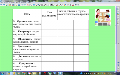 Оборудование: ПК учителя, мультимедийный проектор, презентация Smart, инструкции для работы в группе, таблица для распределения ролей в группе и проведения внутренней оценки, учебник, раздаточный материал для каждой группы.