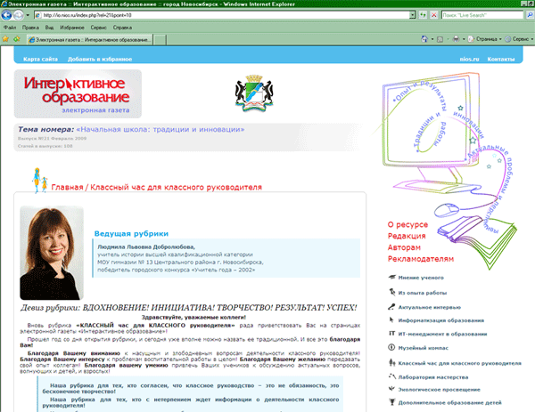 Учителю в современном информационном потоке очень важно найти источник, дающий актуальную, правдивую и своевременную информацию, место, где можно поделиться своим опытом и осмыслить опыт коллег. Это важно и для профессионального роста, и для подтверждения своей квалификации. Таким местом для многих стала электронная газета «Интерактивное образование» и один из ее разделов – рубрика «Классный час для классного руководителя».