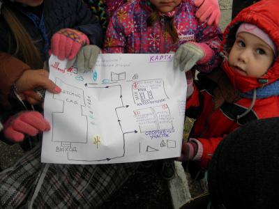 У выхода из здания детского сада показываю детям карту, которую я обнаружила утром в группе. Дети строят предположения, кто же им принес карту? Намекаю воспитанникам, что возможно, это ворона, наблюдение за которой вели на прошлой прогулке. На карте указано местоположение сюрприза, карта поможет добраться и его обнаружить, при этом, дети должны выполнить задания, указанные на карте.