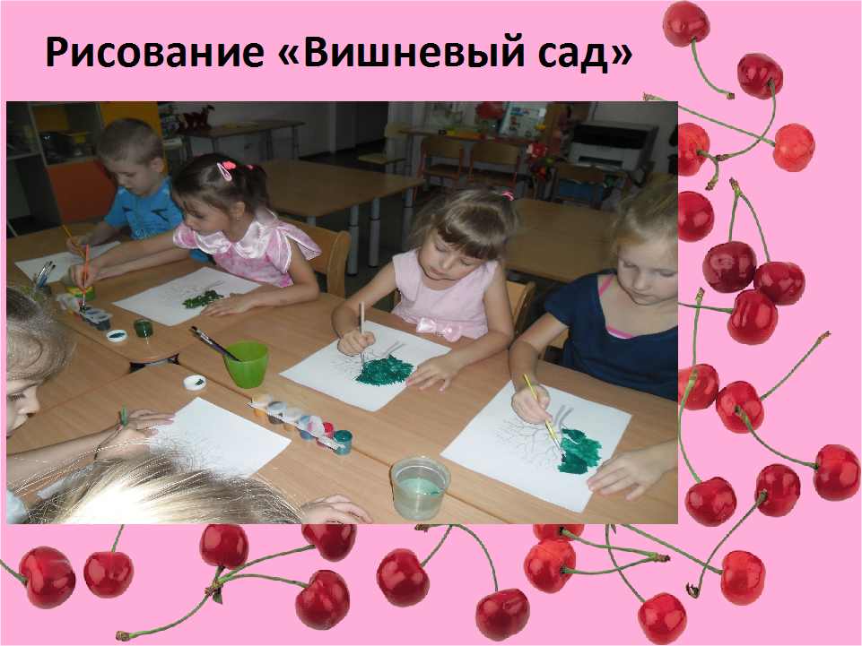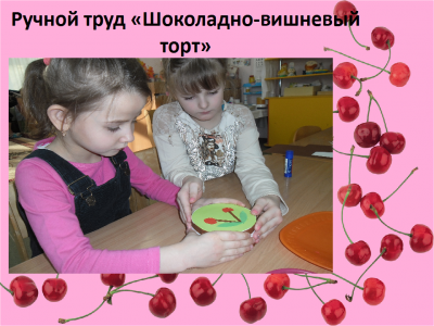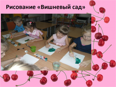 – Подготовка к выставке детских работ на тему «Вишневый сад», аппликации «Вишневый компот», ручной труд «шоколадно-вишневый торт».